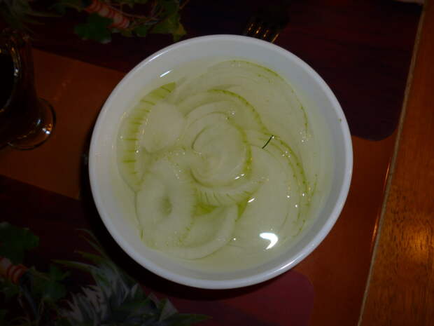 маринованный лук. Лук тонко порезать и залить минут на 30 холодной водой с уксусом.