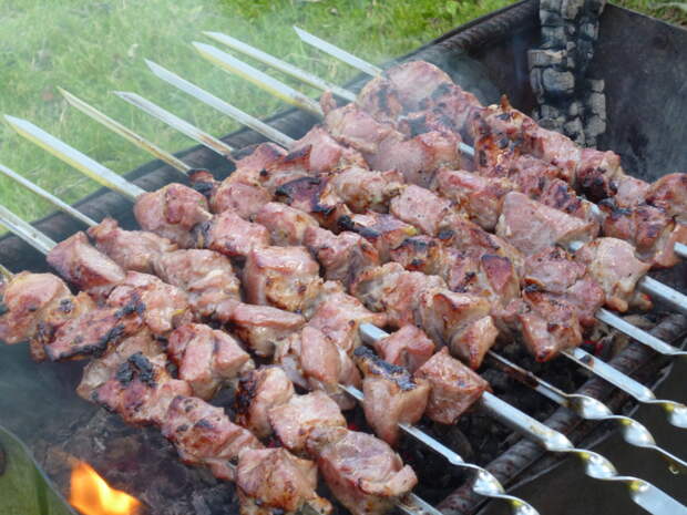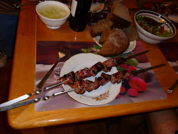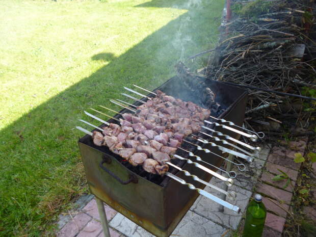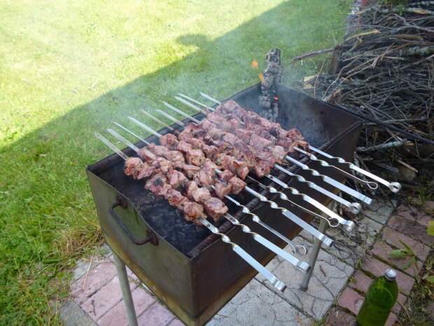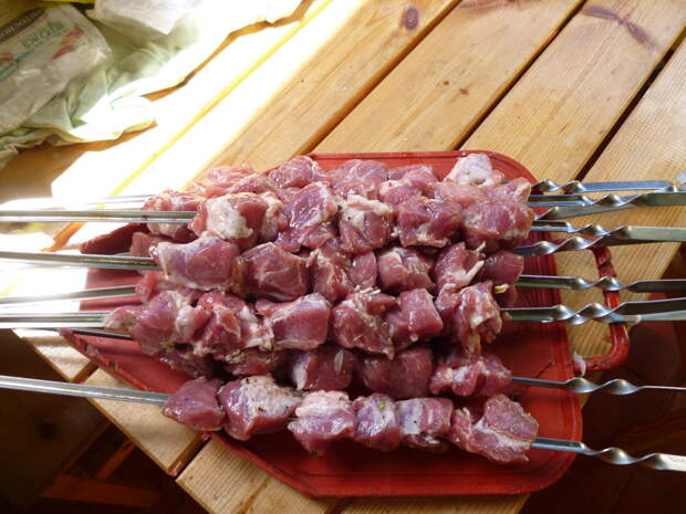Как только прогорают дрова,маринованое мясо очищаем от лука и лаврушки и нанизываем на шампура.