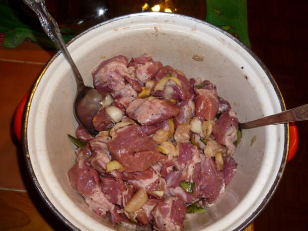Покупаю свиную шейку.Папа режет мясо,добавляем лук репчатый,перец.лавровый лист.небольшое количество меда.