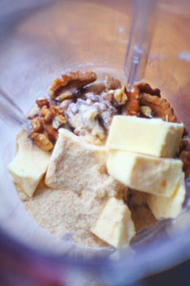 Теперь приготовим крошку. Для этого смешиваем сливочное масло, орехи и панировочные сухари в блендере и измельчаем до состояния крошки.