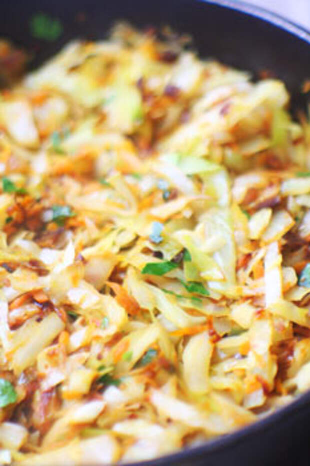Слегка обжариваем и добавляем капусту. Солим, перчим, добавляем зелень и тушим до полуготовности капусты.